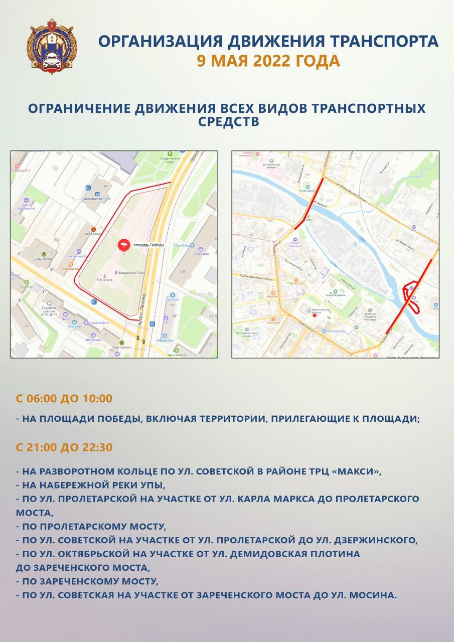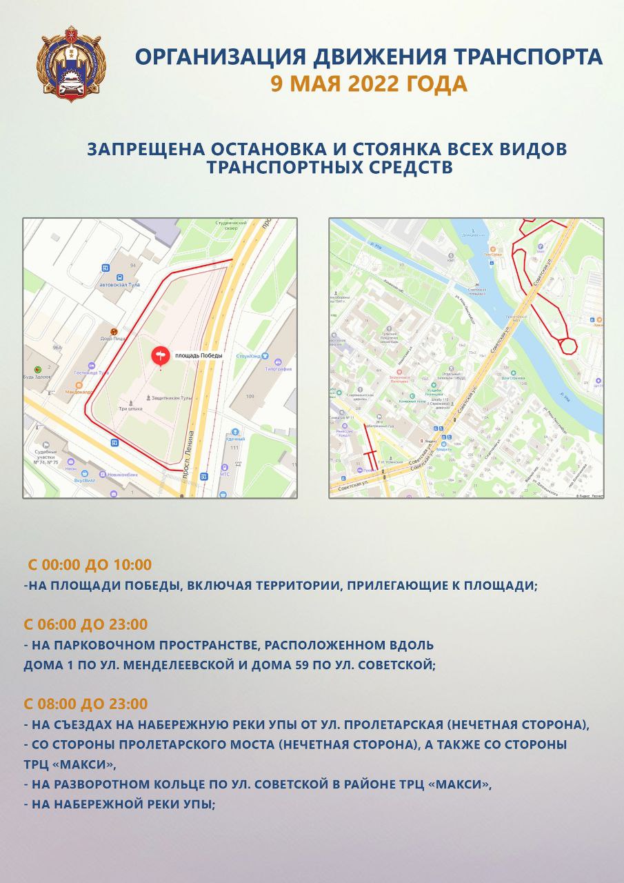 Сегодня в Туле пройдут масштабные мероприятия в честь празднования годовщины Великой Победы. В связи с этим в огороде будут введены ограничения движения и парковки транспорта. Запреты касаются в основном центра города, где и пройдет основная часть событий. Поэтому заранее продумывайте пути объезда. Публикуем схемы от ГИБДД.