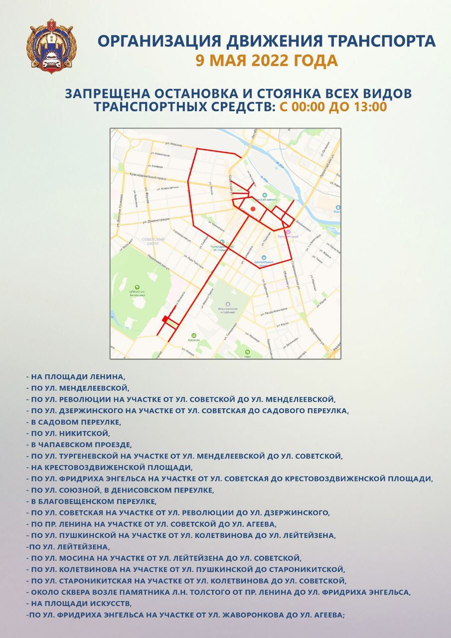 Напомним, до 12 мая нельзя будет парковаться на стоянке вдоль площади Ленина. А 10 мая в Туле пройдет официальное открытие мотосезона. Из-за этого во вторник на площади Победы и прилегающих территориях с 00:00 до 15:00 будет запрещена остановка и стоянка, а с 12:00 до 15:00 будет ограничено движение всех видов транспортных средств на этом участке.