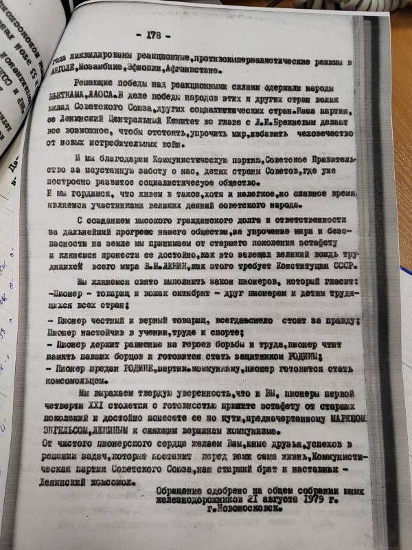 Недавно была завершена реставрация текста. Напомним, капсула времени была заложена 21 мая 1979 года. Ее вскрыли, по заветам авторов, на 100-летие пионерии – 19 мая 2022 года.