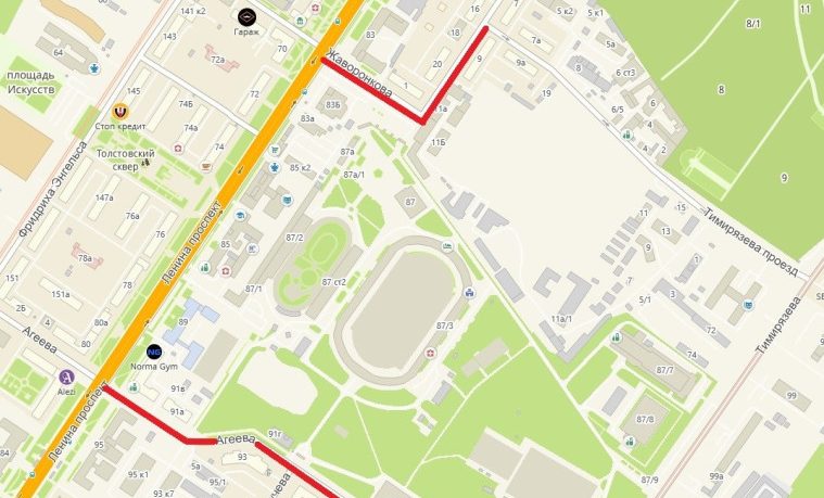 улица Жаворонкова — от Мориса Тореза до проспекта Ленина;